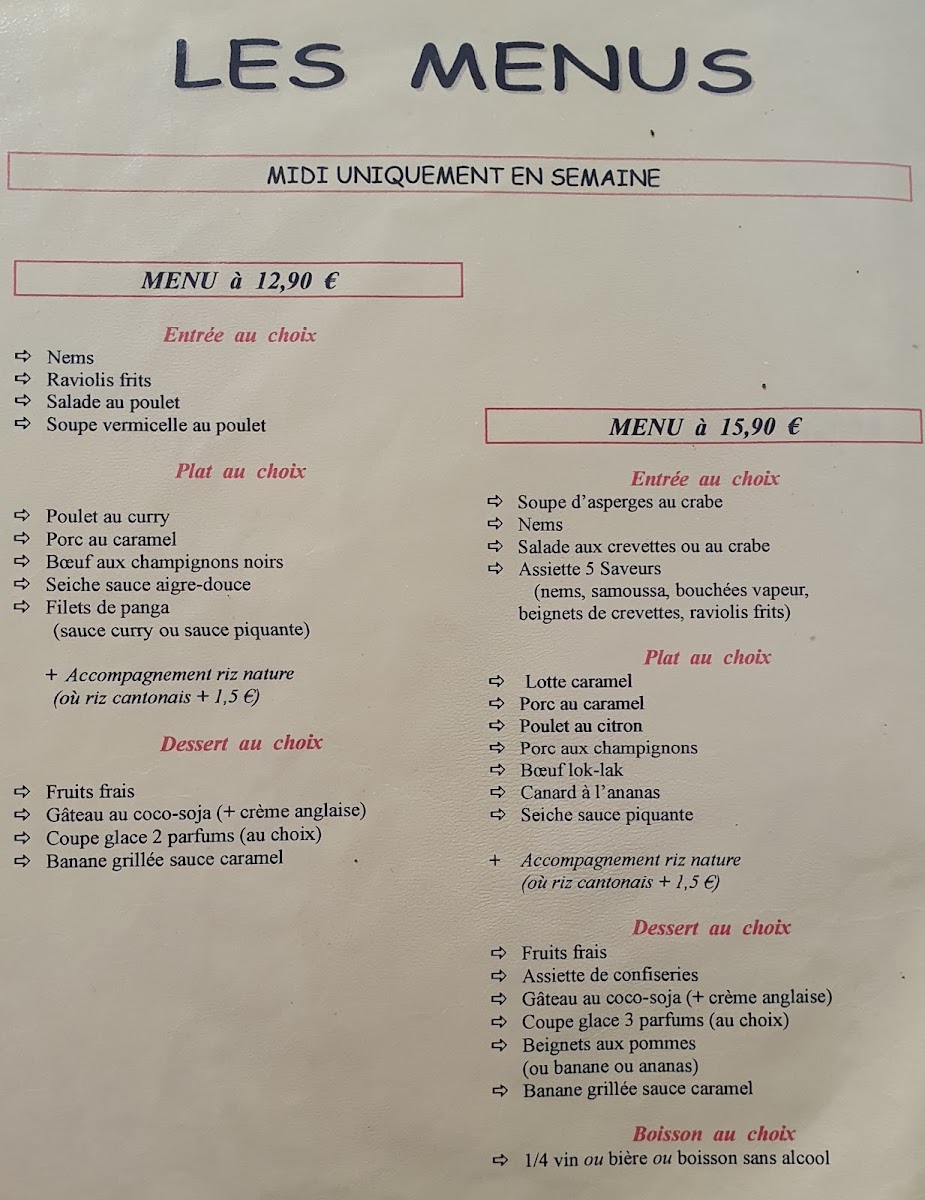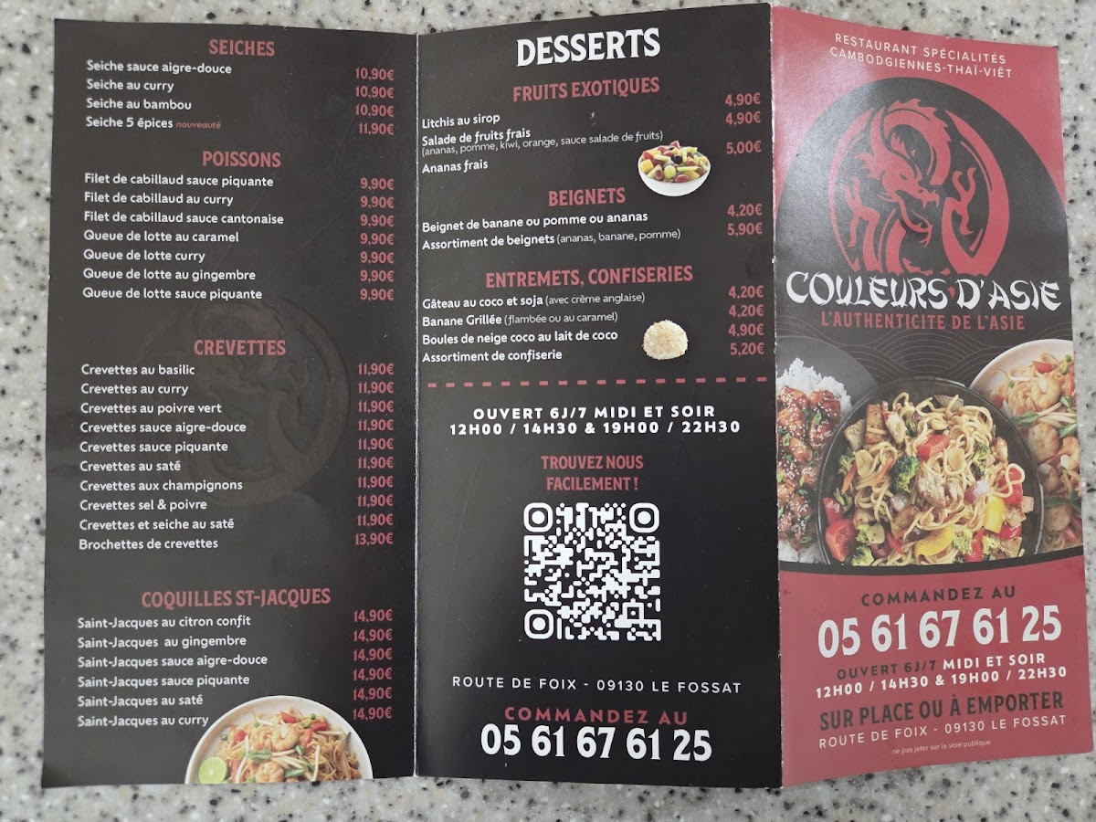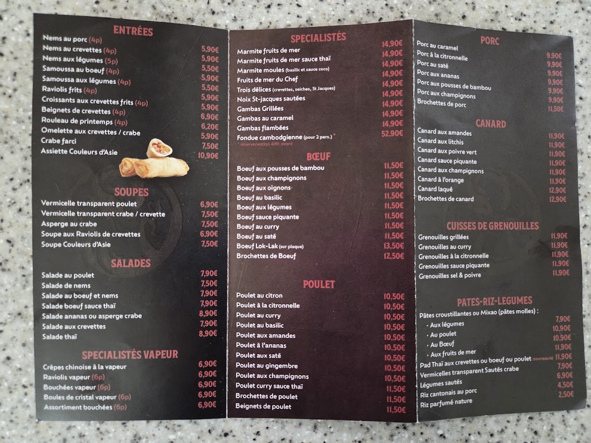 The menu at Couleurs D'Asie offers a vibrant fusion of flavors from across Asia, with each dish promising a delightful culinary experience. The Assiette Couleur d’Asie stands out as a colorful, hearty platter, perfect for those wanting to sample a variety of traditional Asian dishes. For a comforting and rich starter, the Soupe Traditionnelle Khmer brings the delicate flavors of Cambodia to the table, a warm, aromatic choice that sets the tone for the meal. Pairing well with the meal, the Chinees Bier offers a refreshing, crisp taste that complements the rich, flavorful dishes. A true highlight is the Boeuf Lok-Lak, a savory Cambodian specialty with tender beef stir-fried in a tangy sauce, showcasing the restaurant’s commitment to authentic Asian cuisine. Whether you're in the mood for something light and refreshing or a dish with deep, bold flavors, Couleurs D'Asie delivers a well-rounded menu with something for everyone.